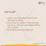 usage: apply a coat of this ghee lip balm generously whenever you need and even you eat up, nothing to worry, there's nothing that's synthetic