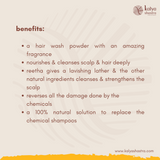 benefits: a hair wash powder with an amazing fragrance. nourishes & cleanses scalp &  hair deeply. reetha gives a lavishing lather & the other natural ingredients cleanses & strengthens the scalp. reverse all the damage done by the chemicals. a 100% natural solution to replace the chemical shampoos.