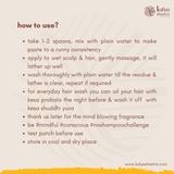 usage: take 1-2 spoons, mix with plain water to make paste to a runny consistency. apply to wet scalp & hair, gently massage, it will lather up well. wash thoroughly with plain water till the residue & lather is clear, repeat if required. for everyday hair wash you can oil your hair with kesa prabala the night before & wash it off with kesa shuddhi yuva. thank us later for the mind blowing fragrance. be #mindful #conscious #noshampoochallenge