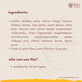 ingredients: reetha, shikekai, amla, henna, indigo, nannari, hibiscus leaves, rose petals, neem leaves, neem bark, licorice, tulsi, carrot leaves, jadaamanjal, malaivembu, vilvam, kuppaimeni, magizhampoo, chitramoolam, aavarampoo, castor seeds, karboga arisi, chitrak, rosemary leaves, lemon grass