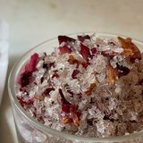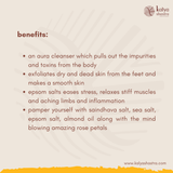 with saindhava salt, sea salt, epsom salt, almond oil, the mind blowing amazing rose petals, the foot soak will help feel so pampered. this is also an aura cleanser. a cleansing agent, pulling out the impurities and toxins from the body and relaxing the tissues epsom salts eases stress, relaxes stiff muscles and aching limbs and softens skin.