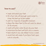 how to use: wash and clean your feet. fill a foot tub with enough warm water to cover the feet up to the ankles, add 1 or 2 spoons of paadha lavanam. place the clean feet in the salt soak for about 10-15 minutes. wash with plain water & pat dry your feet. moisturize the feet well with oils or creams. best results if you use atleast twice a week.