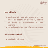 ingredients: saindhava salt, sea salt, epsom salt, rose, neem, almond oil, coconut oil, sesame oil, essential oils based on aromatherapy for aura cleansing with loads of good vibes, care, affection & prayers