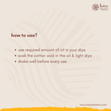 use required amount of oil in your diya, soak the cotton wick in the oil & light diya.shake well before every use.