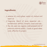 this oil is carefully, lovingly made with the blend of 5 types of oil that are meant for overall human well-being, evolution, health, happiness, wealth & prosperity. the proportions of oils used is exactly as per the traditional scriptures that are ideal to be used at our home & offices.